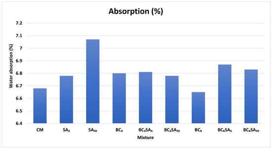 - The water absorption values of the binary blend samples made up of BC6SA5 and BC6SA10 increased by 2.84% and 2.24%, respectively. This can be explained by the impact of these binary mixes, and several factors can be attributed to the increased water absorption. Biochar is noted for its very porous nature, which allows it to form additional water absorption channels inside the mortar.