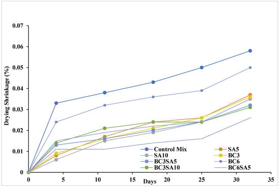 - With a pozzolan and water–binder ratio of 0.35, the binary blends with BC6SA10, BC3SA10, BC6SA5, SA10, BC3, SA5, and BC6 showed a considerable decrease in dry shrinkage when compared to the control mix. These decreases were due to the advantageous synergistic interactions between biochar (BC) and sludge ash (SA). This combination improved the stability and decreased volume variations during drying shrinkage, resulting in an improved pore structure and overall shrinkage.