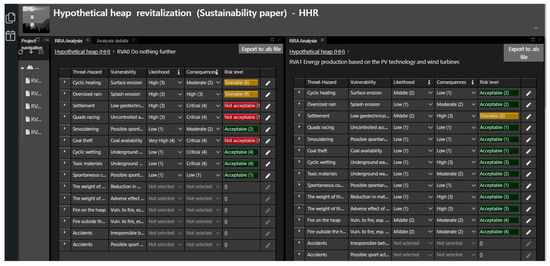 - How can we provide information to decision-makers?The general picture of the revitalization project is represented by the aggregated results view (Figure 7), showing in one table a common and arbitrary set of important parameters for each RVA selected by the authors. More detailed data can be found in the RRA, CBA, and QCA analytical tables (Figure 4, Figure 5 and Figure 6) and in graphs (Supplementary Materials). Decision-makers can view and print the current version of the revitalization plan document at any time. Decision-makers are provided with extensive, organized data in different levels of detail. Please note that decisions based on risk may yield economically ineffective solutions or solutions that are unacceptable to people living around the heap or harmful to the environment. Even when decisions are based on risk and financial factors, the solutions still might bring negative effects on the environment and society. Three-pillar analyses (RRA, CBA, QCA) provide comprehensive and objective input for decision-makers, allowing the production of several alternatives without unacceptable risks and reasonably aligning with the financial and non-financial perspectives. Therefore, such alternatives can be used as input in the decision process.