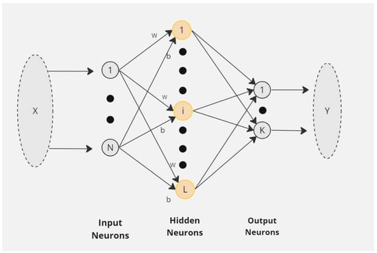 Neural networks belong to a class of intelligent machine learning techniques with variant architectures principally inspired by the structure of the human nervous system [38]. The network consists of layers, including the input, hidden, and output layers, with each layer containing nodes or neurons connected to those in the subsequent layers. In a typical neural network, each node has associated weights and biases that the model learns during training. The weights are updated iteratively using backpropagation (BP) to optimize the model’s error [39]. However, this process can be computationally intensive and dependent on use-case-specific weight initialization, thus resulting in slow training time and poor model generalization. In response to these challenges, Huang introduced the extreme learning machine (ELM) algorithm [23]. Specifically, random weight initialization for the single hidden layer feedforward network (SLFN) was proposed [40]. These random weights are left constant during the training phase, allowing ELM to achieve faster training times and eliminating the local minima problem associated with error optimization. Due to the randomization of biases and input weights in the ELM algorithm, a high complexity of the hidden layer might be required, which hinders the robustness of the algorithm. The implementation of a pseudo-random number generator (seeding) within the MATLAB computing environment controls random weight and biases generations in this work, potentially limiting hidden layer complexity. A network of extreme learning machines is presented in Figure 1.