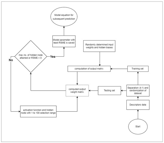 The ELM-based models presented in this study were formulated and developed within the computational framework of MATLAB (MATLAB, 2015a, 2015, MathWorks, Natick, MA, USA). To ensure an equitable and uniform distribution of dysprosium-based magnetocaloric data samples between the training and testing phases of model development, randomization of the descriptors and measured experimental relative cooling power of the samples under investigation was conducted prior to the separation of data, following a 4:1 ratio for training and testing samples, respectively. Effective randomization further prevents possible over- or under-fitting. The purpose of this randomization was to facilitate efficient computation by promoting an even distribution of dysprosium-based magnetocaloric data samples across both modeling phases. The step-by-step procedures for implementing the proposed ELM-based model are outlined as follows: