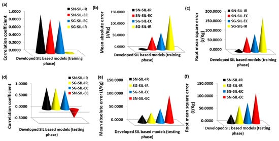 Generalization capacity of developed SIL-based models using (a) training samples coefficient of correlation, (b) training samples mean absolute error, (c) training samples root mean square error, (d) testing samples coefficient of correlation, (e) testing samples mean absolute error, (f) testing samples root mean square error.