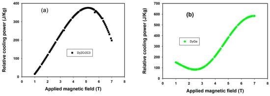 Magnetic field dependence of relative cooling power in (a) Dy2Cr2C3 and (b) DyGa dysprosium-based magnetocaloric compound.