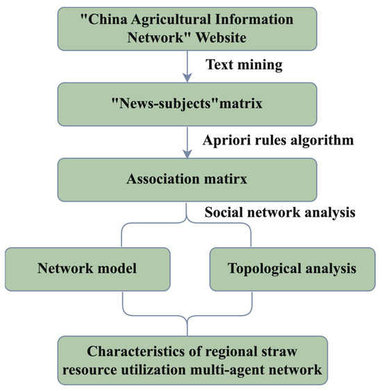 In this research, we employed text mining techniques and the Apriori algorithm for association rules to extract a multi-agent relational database from online news sources, thereby analyzing multiple subjects with strong associations. Building upon this, we constructed a regional straw resource utilization multi-agent relational network, examining its network characteristics, model types, and overall stability through robustness testing, with a focus on the influence of core nodes. Key findings include the concentration of regional straw resource utilization among farmers, businesses, governments, and rural cooperatives. Farmers and businesses emerge as market players, while cooperatives and governments act as external facilitators to enhance market development.