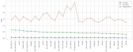 Utilizing the original data derived from multi-agent news mining and applying Formulas (4)–(6), this study has identified significant Leverage, Conviction, and Zhang’s Metric values within the strong association rules of the multi-agent complex network for regional straw resource utilization, as depicted in Figure 3. Among the 30 strong association rules identified, all the Leverage values were positive, with the rule FA ⟹ RC exhibiting the highest Leverage. This indicates that the co-occurrence of FA and RC is more frequent than the product of their independent occurrence probabilities, suggesting a strong positive correlation between them. Similarly, according to the rule RC ⟹ COM, FA showed a high Leverage value, indicating a similar positive correlation. All 30 association rules had Conviction values that were higher than 1, with 13.3% of them exceeding that of 2, thereby affirming their strength. Notably, the rule RC, GO, COM ⟹ FA had a Conviction value of 2.753, underscoring its high effectiveness. This suggests that the occurrence of FA is highly probable when RC, GO, and COM are present, primarily due to government support, corporate utilization, and rural cooperative management of straw resources, which significantly attract farmer participation. The rule RC, GO ⟹ FA had a Conviction value of 2.517, indicating a high probability of FA occurrence in the presence of RC and GO. This suggests that even in the absence of straw resource utilization companies, joint incentives and management by governments and rural cooperatives can enhance farmers’ willingness to utilize straw resources. All Zhang’s Metric values were higher than 0, indicating a strong correlation between antecedents and consequents in this itemset. The rule RC, COM ⟹ FA had a Zhang’s metric value of 0.661, showing a strong positive correlation, thereby implying that transactions including the itemset RC and COM are significantly likely to also include FA. The rule RC, GO ⟹ COM, FA with a Zhang’s Metric value of 0.646 demonstrates a strong association between RC, GO, and COM, FA.