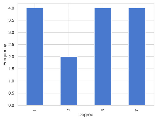 Utilizing Formulas (9)–(11), our research deduced that the diameter of the multi-agent network in regional straw resource utilization is 3, with an average path length of 1.945. This signifies that, on average, a fluctuation in one node can be triggered in just 1.945 steps, reflecting the close-knit connectivity of the network. The high interconnectivity among various agents, such as government, farmers, and businesses, implies that a change in the state of one node can easily instigate a chain reaction among the others, thereby facilitating the effective allocation and utilization of straw resources. Moreover, the network exhibits a high clustering coefficient of 0.319, indicating a tendency towards tightly knit groupings. Consequently, with its relatively short average path length and high average clustering coefficient, this network aligns with the characteristics of a small-world network. Accordingly, we classify the multi-agent network in regional straw resource utilization as a Newman–Watts small-world network, as evidenced by the uniform degree distribution shown in Figure 5. This classification underscores the network’s capability for rapid information and resource dissemination. Even if certain connections or nodes undergo changes, the network retains its core functionality, demonstrating robustness and adaptability to new dynamics. Furthermore, the diverse cooperative models among the different agents contribute to a complex dynamic equilibrium within the network.