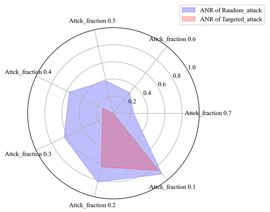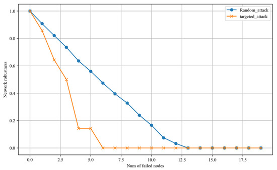 Our study explored the impact of different attack ratios, specifically those of 20%, 40%, and 50%, on the average network reachability following random and targeted attacks, as depicted in Figure 8. After randomly removing 20% of the nodes, the size of the network’s largest connected subgraph was on average 82.285% of the original network, thereby indicating that the overall structure and function of the network remain relatively stable when nodes are randomly removed. However, the average network reachability after targeted attacks was 0.6428, signifying that the targeted removal of critical nodes severely impacts the overall connectivity of the network. Similarly, when 40% of the nodes were randomly removed, the average size of the largest connected subgraph reduced to 55.428% of the original network, thereby demonstrating a certain degree of robustness to random attacks but with a significant loss in connectivity. At this point, the average reachability under targeted attacks dropped to 0.1429, indicating that the robustness of the network significantly diminishes under deliberate attacks, with the largest connected subgraph reducing to approximately 14% of the original network. This highlights the severe impact on network connectivity and functionality when critical nodes are targeted. When the attack rate reached 50%, the average network reachability after targeted attacks dropped to 0, signifying the complete collapse of the network.