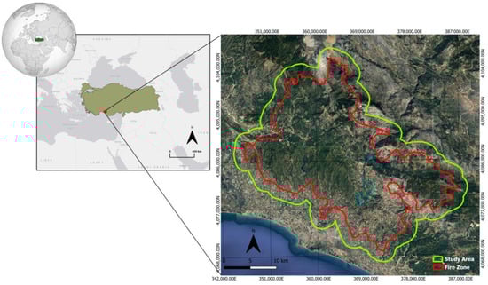 Forest fires, which are prevalent in various biomes globally, alter the scope and structural characteristics of forested areas. Consequently, these changes disrupt the provision of ecosystem services and products, introducing uncertainties into the trajectory of these alterations [1]. Within the context of global climate change, the frequency of severe forest fires tends to rise, necessitating an accelerated adjustment of forest fire regimes [2]. Forest fires are complex natural disturbances that significantly influence ecosystem dynamics [3] and have profound impacts on human societies [4,5]. A continuous increase in fire danger and the extent of burned areas in Mediterranean ecosystems across diverse global regions is expected due to factors such as global warming, population growth, and irregular land use [6,7]. This increase underscores the growing significance assigned to forest fire risk and susceptibility [8], as well as to post-fire studies [9,10]. To enhance firefighting success, risk-based possibilities, and their management information should be integrated into decision-support systems through strategic and operational synthesis [11,12]. Achieving effective fire decision support necessitates a precise clarification of uncertainties associated with risk. Therefore, it is crucial to explain the uncertainties arising from spatial patterns, understand their origins, and make up-to-date decisions regarding fire prevention and explosion probability [13,14].