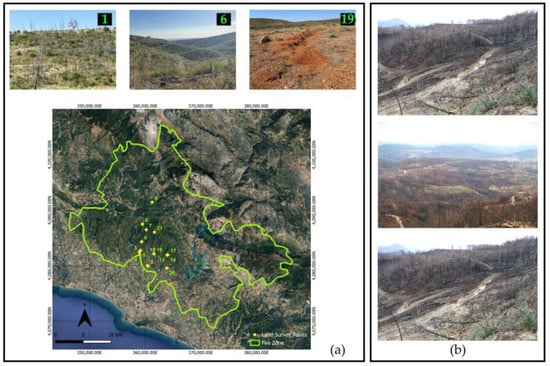 (a) Samples from field measurements (b) Examples of trees affected to varying degrees by the fire and a sample of a completely burned forest area.