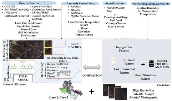 In this study, the outcomes of the risk analysis conducted prior to the 2021 Manavgat wildfire were compared with the results of burn severity derived from satellite imagery. Figure 3 represents the general flow diagram of the methodology used in the study.