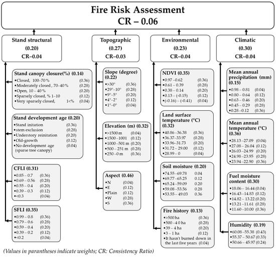 In this study, the FAHP was used to determine the importance levels of the criteria that constitute fire risks and their sub-criteria weighted according to relevant factors. The 4 main criteria of fire risk and their respective intervals of sub-criteria were established in a hierarchical manner for the FAHP risk assessment (Figure 4). By applying the pairwise comparison matrices of the Chang extent analysis method step-by-step [23,58], the weights of the criteria and sub-criteria were determined in accordance with a valid consistency index. The consistency ratio (CR) and consistency indices were used to analyze the consistency of the pairwise comparison matrices. Particular attention was paid to a consistency index of <0.1. The fuzzy scale of relative importance developed by [59] was employed to quantify the relative weights (Table 2).
