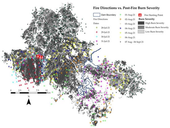 One of the essential factors influencing the expansion of fire in forested areas is the external intervention made to control the fire. The direction of spread during the days when the fire continued was evaluated in conjunction with the results obtained from the MODIS images, as depicted in Figure 6 This figure illustrates the development and severity of the fire from its initial outbreak, which was controlled. The fire commenced on 28 July 2021, advancing with high intensity towards the south in the mountainous area within the first 24 h. On the 3rd day, as the fire predominantly moved towards the north in sporadic locations, it also moved towards the east. By the 4th day, the fire reached the Case 2 area, located further east. In this section, although the intensity decreased due to LULC and the dam, it remained active over the forest areas, progressing over the northeastern mountainous region of this section for an additional 3–4 days. During the same period, the fire moved north. In this region, there are deep valleys and long mountain slopes. Generally, the fire remained active in the mountainous region during the last 3–4 days of the fire. It is understood that during these final 3–4 days, the fire was also effective in the region between Case 1 and Case 2. Overall, the variable topography in the northern regions facilitated local winds during the fire, and it was observed that the progression of the fire frequently changed according to wind direction. The higher elevation in the northern regions, prevalence of low-vegetation rocky areas, and absence of Scots pine and hard-soiled vegetation cover contributed to easier control of the fire. The fire initially progressed towards the south in the mountainous area with strong northerly winds. The higher density of settlements and agricultural areas further south can be explained by the lower fuel materials. On the 3rd day, when the fire turned towards the north and then to the east, it could be attributed to finding new fuel material sources and a more effective topography. The threat posed by the fire to settlements reaching the south in the first two days shifted the firefighting organization to this region. The reason for fire weakening and moving towards the north and then to the east on the 3rd day was due to the presence of a weaker firefighting organization in this region.