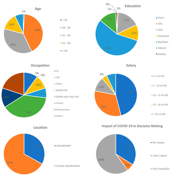 In conducting the survey, demographic data of the respondents were collected, consisting of age, education, occupation, income, and location, as well as the impact of COVID-19 on decision-making. From the survey results, the obtained demographic data are presented in Figure 1.