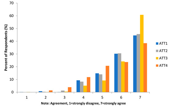 The attitude construct describes the respondents’ attitudes towards the agreement items given in the survey. There are four statements that are considered to represent the attitude construct. The survey results obtained for these four questions are presented in Figure 2. When looking at each question, it is found that for the attitude construct, ATT3 is the most agreed statement by the respondents, which is ‘I like PV Rooftop because it is environmentally friendly’.