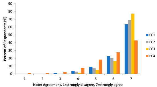 The environmental concern construct describes the respondents’ concern for environmental issues, such as the agreement items given in the survey. There are four statements that are considered to represent the environmental concern construct. The survey results obtained for these four questions are presented in Figure 3. When looking at each question, it is found that for the environmental concern construct, EC3 is the most agreed statement by the respondents, which is ‘In my opinion, every individual has a responsibility to protect the environment.
