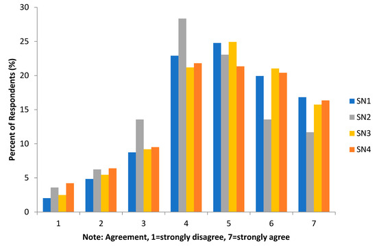 The subjective norm construct describes the social influence of the respondents with the agreement items provided in the survey. There are four statements considered to represent the subjective norm construct, namely statements SN1 to SN4. The survey results obtained for these four questions are shown in Figure 4. When looking at each question individually, it can be observed that for the subjective norm construct, SN1, SN3, and SN4 have almost the same value. These three constructs are the statements most agreed upon by the respondents, namely, “I think people around me believe that I should use PV Rooftop in the near future.”, “I feel that if I buy PV Rooftop, people around me will also buy PV Rooftop”, and “I feel that I will use PV Rooftop if my neighbor uses it”.