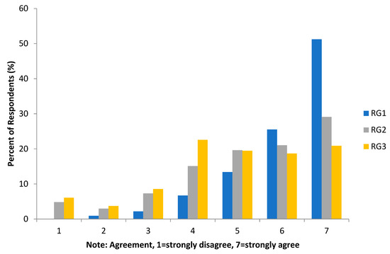 The regulation construct describes the respondents’ views on the items of agreement with the regulations provided in the survey. There are three statements considered to represent the regulation construct, namely statements RG1 to RG3. The survey results obtained for these three questions are shown in Figure 7. When looking at each question individually, it can be observed that for the regulation construct, RG1 is the statement most agreed upon by the respondents, which is “I think the availability of installment packages, promotions, or discounts will increase interest in buying PV Rooftop”.