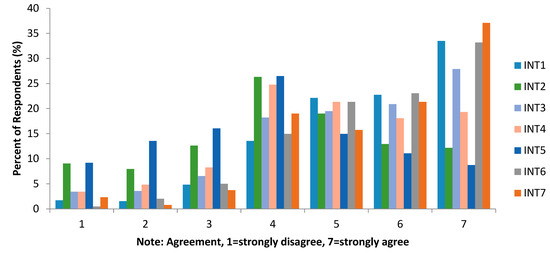 The construct of purchase intention is used to describe the respondents’ perceptions of agreement with the regulations provided in the survey. For the regulation construct, seven statements were identified as representative. These statements are labeled INT1 through INT7. The survey results for these seven questions are shown in Figure 8. When analyzing each statement individually, it was found that for the purchase intention construct, INT7 was the statement most agreed upon by the respondents: “I feel more comfortable buying PLTS from PLN than from other companies”.