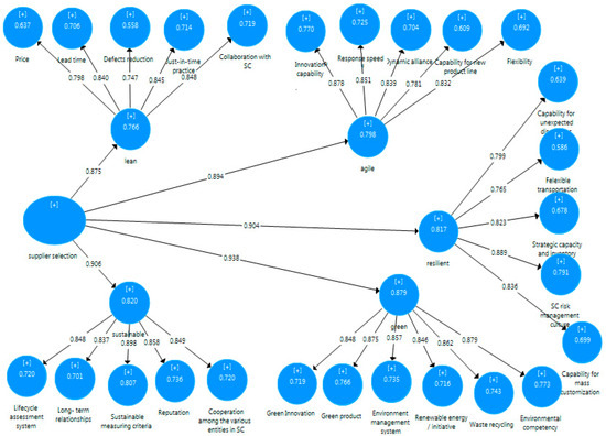Our structural model utilizes a third-order factor analysis with three hierarchical levels. At the first-order level, a combination of indicators or questions accounts for lean components (e.g., price, lead time, just-in-time practices, defect reduction, and collaboration with the supply chain), agile components (e.g., innovation capability, response speed, dynamic alliance, new production line capability, and flexibility), resilient components (e.g., the ability to deal with unexpected disruptions, resilient transportation, strategic capacity and inventory buffer, supply chain risk management culture, and capacity for mass customization), green components (e.g., green innovation, green products, environment management systems, renewable energy/initiatives, waste recycling, and environmental competence), and sustainable components (e.g., life cycle assessment systems, long-term relationships, sustainable measuring criteria, reputation, and cooperation among various entities in the supply chain). The amalgamation of these indicators yielded five components—lean, agile, resilient, green, and sustainable—comprising the second order of the model. Finally, from the combination of these five components, a general variable named LARGS supplier selection was obtained.