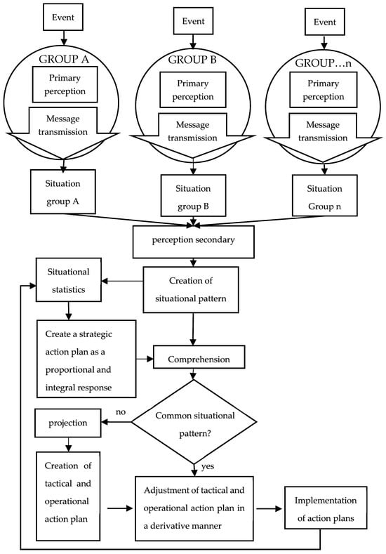 We introduced innovation by establishing the concept of “levels of primary and secondary perception”, which can be managed based on the design of communication groups. Additionally, we defined cognitive work involving the visualization of a “common or special situational pattern” as a discrete event. This, in turn, facilitated comprehension, learning, and the generation of corrective and preventive action plans, which were created proportionally and integrally and applied to the process derivatively. This holistic approach considers the asymmetry that characterizes information flows in productive processes but strategically delivers a level of symmetry in communication within groups, thereby increasing levels of situational awareness in leadership, streamlining resource allocation, and consequently, improving the system’s responsiveness to deviations in process variables. The latter was achieved by designing an integrated communication system comprising operational, tactical, and strategic levels within a company.