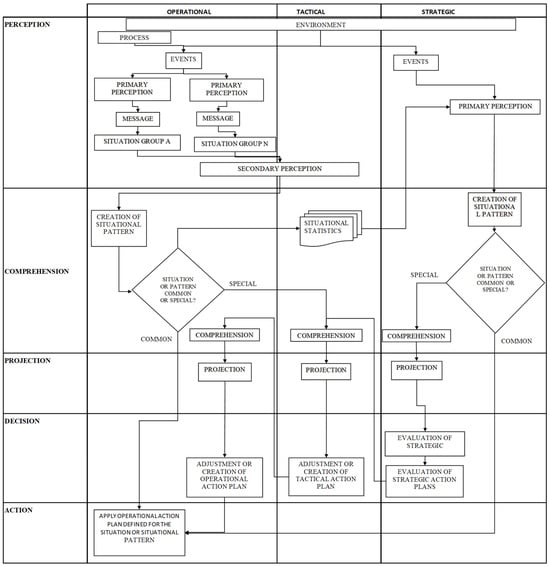 In the second diagram (Figure 2), the model adjusted to the management of industrial processes is presented, allowing the functions of the operational, tactical, and strategic levels to be visualized in the activities of perception, comprehension, projection, decision, and action of the group situational awareness model. Each stage is described below: