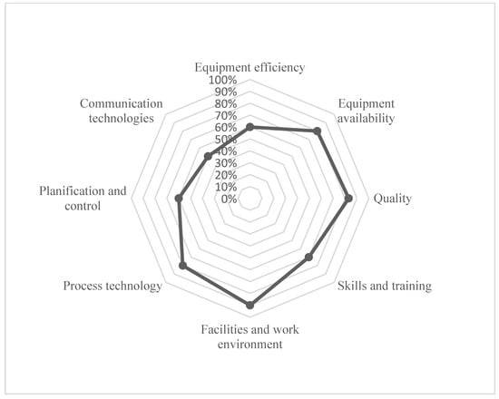 Stage 1. An audit of the manufacturing process is carried out and it is observed that the largest gaps are in the following factors: equipment performance, communication technology, planning and control, and skills and training (see Figure 3).