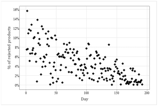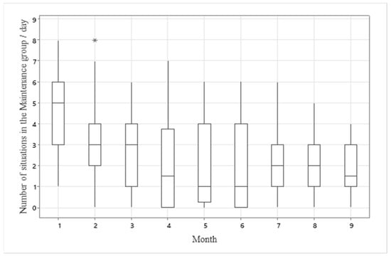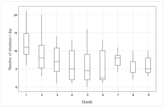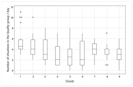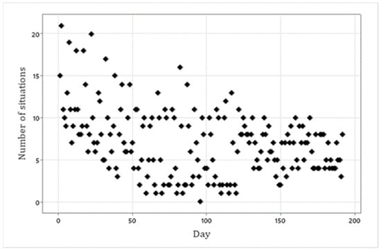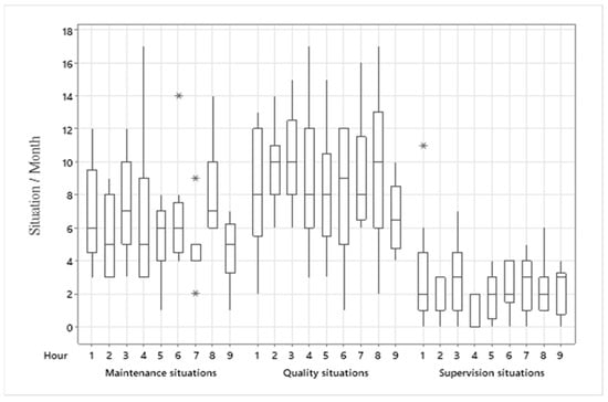 In Figure 13 we can see that there is no behavior that relates the number of situations and the work shift schedule. We can observe more frequently situations originating from the quality group, followed by the maintenance group, and with a lower frequency, the supervision group. Although one might expect a higher frequency at the beginning of the shift, this behavior was not observed. Additionally, although there are anomalous data points, they are not conclusive.