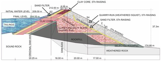 The maximum height of the Almagrera dam is 37.3 m. Due to the accumulating material on its downstream side, it was lifted approximately five times. The side incline was 1.7 (H): 1(V) in the initial three times and 2 (H): 1 (V) in the final two times. The most unfavorable cross-section is given in Figure 1 before the closure and after five raisings. The fill dam has an upstream sloping center zone. A succession of magmatic and inter-stratified deposit rocks shaped its foundations, containing shale, phyllite, lava, and clayey. On the fifth rising period, an aslope gravel filter and sand was set among the fourth and fifth ascending covers, performing a filter standard, in addition to a downstream bottom discharge down it and the downstream cover. As much as a 16 m3/h leakage appeared in the downstream incline. The products of the excavations that were obtained were placed in the dam, but with rockfill at the base. There were also different drains (in yellow) and quarry-run (permeable) on the outside. The unfavorable section plan detail of the Almagrera dam before its closure is presented in Figure 1.