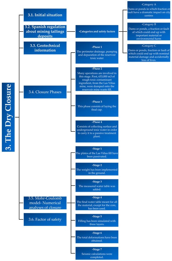 A plan for the dry closure of the mine was promoted by the Ministry of Science and Innovation of the Spanish Government. The dry closure of a dam means that all the water accumulated in its tailings is going to be extracted and that it is going to be waterproofed to avoid water entering in the future. A brief description of the project follows. The details of the dry closure are presented in the flow chart in Figure 2 below for a better understanding.