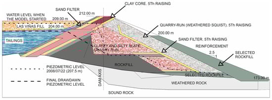 At the first stage of the project, a great deal of toxic accumulation occurred a few meters underwater. The puddle was absolutely polluted by the chemical mine waste fill and rose two hundred and nine meters above sea level (Figure 1). During the closure works (see Section 3.4), the original section was modified by a rockfill reinforcement. In addition, a drawdown was carried out and more material (the Las Viñas fill) was put above the tailings. Figure 3 displays the final central section plan detail.