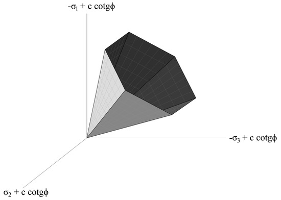 Numerical analyses of closure were conducted via the Finite Element (FE) method and the triangular 15-nodes elements utilized. To analyze the materials performance, a Mohr-Coulomb formula was utilized, which is a pattern of perfect, non-associated plasticity. The six yield functions (1) describe a hexagonal shape in the stress region [49]. Mohr-Coulomb failure surface in principal stress space is depicted in Figure 4.