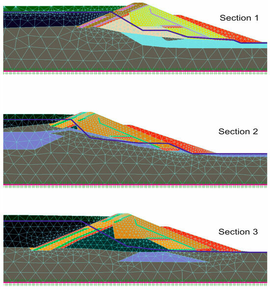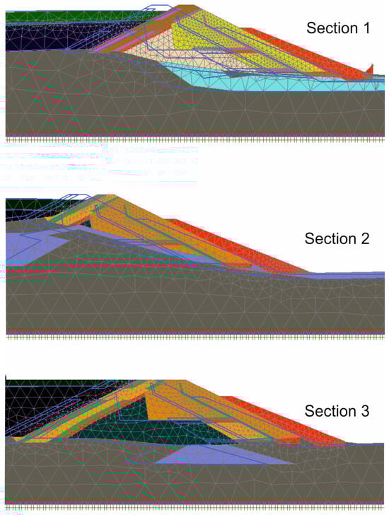 In situ and laboratory experiments have been executed to characterize the properties of the dam materials. Five boreholes—one on the top, two in the downstream slope, and two in the upstream slope—have been bored in each of the three cross-sections analyzed, spaced about 50 m apart. The distribution of boreholes in the central section can be observed in Figure 1. Table 1 shows the materials considered and their calculation parameters. It should be noted that soft tailings and medium tailings are two hypotheses considered for the same material.