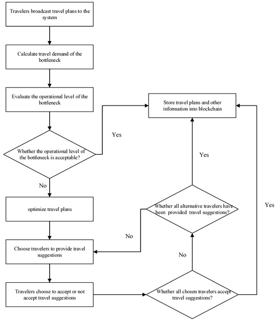 The workflow of the system is shown in Figure 1. First, travelers share their travel plans through the system before traveling, informing the system of the time they plan to arrive at the bottleneck. Second, the system calculates the number of vehicles arriving at the bottleneck in each time interval and evaluates the operational level of the traffic bottleneck based on the shared travel plans of travelers. Furthermore, if the operational level of the bottleneck is acceptable, the system stores travel plans and other information into the blockchain. If the operational level of the bottleneck is not acceptable, the system uses an optimization model to automatically generate travel plan regulation schemes and chooses travelers to provide travel suggestions. Then, travelers are free to choose whether to accept the travel suggestions provided by the system and change their travel plans. Next, the system checks whether all chosen travelers accept the travel suggestions. If all chosen travelers accept the travel suggestions, the system stores travel plans and other information in the blockchain. If not all the chosen travelers accept the travel suggestions, the system checks whether all alternative travelers have been provided with travel suggestions. If all alternative travelers have been provided with travel suggestions, the system stores travel plans and other information in the blockchain. If not all alternative travelers have been provided with travel suggestions, the system returns to the step of choosing travelers to provide travel suggestions to and continues. This method uses hash algorithm encryption, and each traveler has a private key and a public key. Through public key and private key technology, travel plans can be shared while protecting each traveler’s privacy. To incentivize travelers to share travel plans and accept the travel suggestions provided by the system, travelers can be rewarded with points in the form of smart contracts, which can be used to redeem daily consumption vouchers for gas and parking fees.