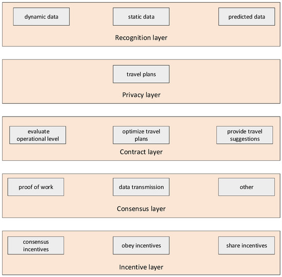 To integrate the multisource information mentioned above, a multilayer blockchain system is adopted for data storage and processing, as shown in Figure 3, and it includes the recognition layer, privacy layer, contract layer, consensus layer, and incentive layer. (a) Recognition layer: used to store and process dynamic data, static data, and predictive data. Dynamic data include dynamic traveler information and dynamic traffic bottleneck information. Static data include static traveler information and static traffic bottleneck information. Predicted data include the predicted results of dynamic traffic demand. (b) Privacy layer: used to identify travelers and store and process travel plans; (c) contract layer: used to evaluate operational level, optimize travel plans, and provide travel suggestions; (d) consensus layer: used for proof of work and data transmission; and (e) incentive layer: used to store consensus incentives and implement incentive functions, including obeying incentives and sharing incentives.