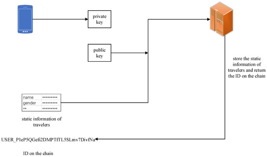 Because each traveler is treated as a node in the proposed blockchain system and the amount of travel data related to each node is relatively large, a high level of computer processing is needed to upload travel information to the blockchain system. To solve this problem, travelers’ information is divided into static information and dynamic information. Static information refers to information that remains unchanged for a long time, such as name, age, gender, and private car license plate number, while dynamic information refers to information that frequently changes over time, such as travel plans. As shown in Figure 4, to improve the upload speed of the blockchain system, static information is registered and stored through regulatory authorities such as urban traffic management departments, and dynamic information is shared through the blockchain platform. When uploading information to the blockchain system, each traveler’s static information corresponds to an independent ID for uploading, reducing the computational complexity, and ensuring the operational efficiency of the system.