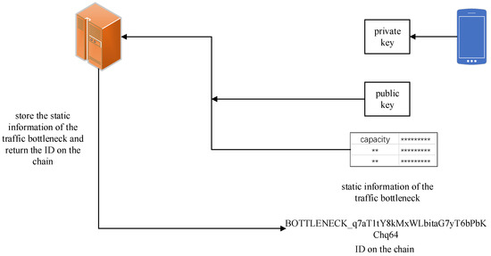 Similarly, as shown in Figure 5, static traffic bottleneck information is registered and stored with independent IDs by regulatory authorities. By linking an ID with a traveler’s travel plan information when uploading shared data to the blockchain system, the computational complexity is reduced, and the extraction of key bottlenecks or areas is facilitated based on the ID approach.