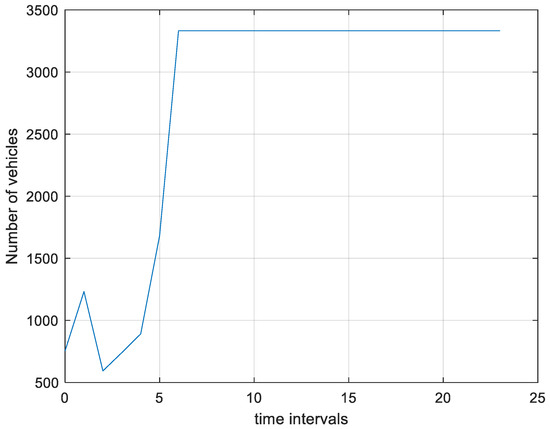 Figure 8 and Figure 9 show the regulated number of arriving vehicles in each time interval and the number of vehicles transferred in each time interval, respectively. Notably, in Figure 8, after regulation, the number of vehicles in each time interval does not exceed the capacity; thus, there are no delays. This verifies the effectiveness of the proposed regulation model. In Figure 9, both the x-axis and y-axis represent time intervals, while the z-axis represents the number of vehicles transferred from time intervals on the x-axis to time intervals on the y-axis. From Figure 9, We can see that the data of transferred vehicles are mainly near a diagonal line from left to right in the figure. This indicates that for most travelers who need to change their travel plans, the regulated time interval is very close to the original planned time interval. Changing travel plans may inconvenience travelers, especially when the regulated time interval is far from the original planned time interval, and the regulation model can minimize such inconveniences.