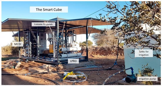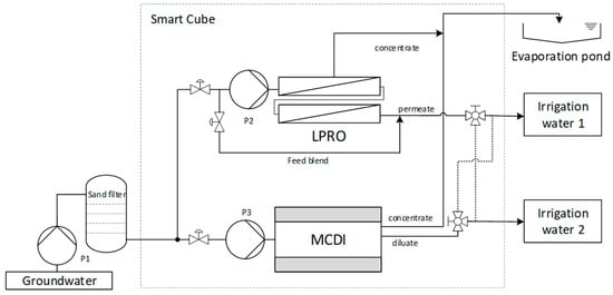 Two innovative technologies were implemented in the Smart Cube: Membrane Capacitive Deionization (MCDI) and Low-Pressure Reverse Osmosis (LPRO) (see Figure 2). A detailed plant description was reported in Cañas Kurz et al. [13].