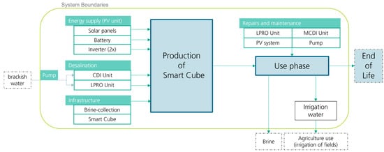 In the present study, the production of irrigation water (functional unit, FU; one cubic meter (1 m3 of desalinated water)) is assessed using LCC and LCA in accordance with ISO 14040/44. The system boundary is gate-to-gate, which relates only to Smart Cube production and maintenance activities (see Figure 3). The focus of this study is the evaluation of the potential environmental impacts and economic implications along the life cycle of the Smart Cube, including desalination technologies and a PV system.