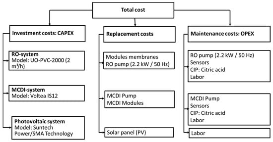 The total cost of each technology is compared based on the production capacity of desalinated water, as well as the total water cost per cubic meter [32].
