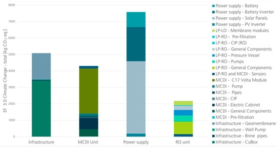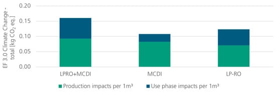 In addition, the comparison of the desalination technologies (Figure 9) was performed with LPRO only, MCDI only, and LPRO + MCDI (equal amount of water throughput). Each technology option includes the power supply and the infrastructure. The water throughput and the groundwater depth were set as the base scenario. While the production phase is relatively similar, a closer look reveals that the impact of the use phase of the LPRO, and therefore the total CO2 emissions, is higher than that of the MCDI unit.