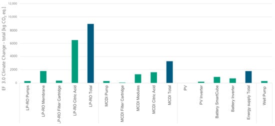 To date, only a handful of LCA publications have been published for both LPRO and MCDI, while comparisons of both technologies are scarce. Yu et al. (2016) [22] and Shiu et al. (2019) [23] carried out an LCA and a hotspot analysis for MCDI, identifying some electrode materials that have the most environmental impacts. Results also showed that the MCDI system has potential advantages to be an efficient water technology with low energy consumption and low energy-related environmental impacts. Another study conducted by Çetinkaya (2020) investigated the environmental impacts of MCDI technology during the removal of nitrates from water using LCA. The results showed that the MCDI system showed the greatest potential during its operational phases and that its environmental impacts mainly depended on the type of materials used in the manufacturing process; the most important environmental impact was the water consumption [24].