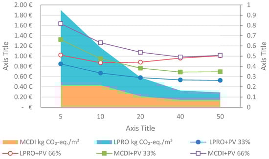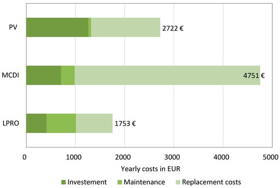For LCC, an overview of the yearly costs for all three systems is given in Figure 7. The yearly costs totaled EUR 4751/yr for the MCDI, followed by the PV system at EUR 2722/yr, and the LPRO system with EUR 1753/yr. When comparing investment, maintenance, and replacement costs, the highest expenses were attributed to the replacement costs which ranged between EUR 742 (LPRO) and EUR 3766 (MCDI) per year. This accounted for 42% and 79% of the total yearly costs, respectively.