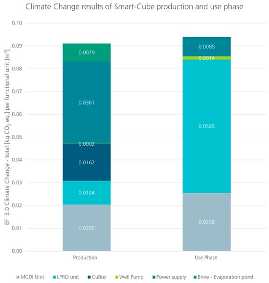 Figure 8 shows the climate change impact values in kg CO2-eq. per functional unit (m3) of the Smart Cube. The hot spot of the production phase placed the power supply unit on top with 0.0361 kg CO2-eq/m3, followed by MCDI unit (0.0205 kg CO2-eq/m3) and the CuBox (0.0162 kg CO2-eq/m3). On the other hand, in the use phase, the LPRO unit maintenance had the greatest impact, with 0.0585 kg CO2-eq/m3 and more than double the emissions of the MCDI.