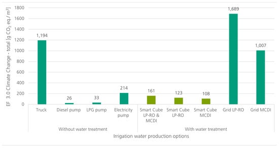 The baseline scenario of Smart Cube approach is further compared to the current Moroccan electricity grid and the alternative irrigation options impacts. The results show the high contrast of using electricity and delivery of water by truck instead of the Smart Cube (Figure 10). Due to heavy share of fossil fuels powered electricity [34], the impacts are 1689 and 1007 g CO2-eq. per m3 for LPRO and MCDI, respectively. For the fuel consumption of the diesel-powered trucks, each truck emits 1194 g CO2-eq. per m3 if the same amount of irrigation water was delivered over the lifetime of the Smart Cube (161 g CO2-eq./m3). For pumping purposes, using a diesel pump or LPG pump alone would have less impact than the Smart Cube. For an electricity-grid-powered pump, the impact results are higher, with higher CO2-eq. per m3 than the Smart Cube.