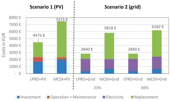 Based on the inventory data for the production and maintenance collected in the LCA, the investment, replacement, and maintenance costs associated with the different units of the Smart Cube (LPRO unit, CDI unit, and PV unit) were collected from actual purchase values and costs incurred during operation as well as assumption and calculations (see Appendix A, Table A3). The amortization of the investment costs is based on a life span of 30 years. This includes the replacement of key components over the entire life span.
