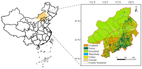 Geography of the study area and land use in 2020. Note: I. Sandy area with an arid grassland. II. Hunshandake sandy land. III. Psturage ecotone sandy land. IV. Yanshan mountain water conservation area.
