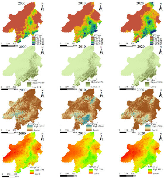 Figure 2 and Table 2 show the spatial distribution and quantitative changes in the four ecosystem service functions of the BTSSCP from 2000 to 2020. The total capacity of WC increased from 1.6 billion m3 to 2.3 billion m3, while the average WC increased from 3.53 mm to 5.16 mm in the BTSSCP from 2000 to 2020. WC showed spatial distributions as being “high in the east and low in the west” and “high in the south and low in the north”. The areas with high values included the Yanshan Hills Mountain Water Source Protection Area, the Hunshandake Sand Land Control Area, the agricultural–pastoral transition zone, and the eastern part of the land management area. The total volume of conserved soil increased from 419 million tons to 460 million tons within this period. The spatial distribution of the SC shows that the eastern part of the area had high values of WEC, while the arid areas in the western part had lower values. The area occupied by forestland and grasslands increased significantly, and this explains why SC services have increased significantly over the past two decades. The western arid grassland areas of desertification control have remained stable for many years. More significant changes were observed in the total amount of WEC, which increased from 2.7 billion tons to 3.1 billion tons during the study period. The high-value area was distributed in the southwest of the study area at the early stage, and at the late stage, it was mainly distributed in the northwest of Beijing, Weichang County of Chengde City, and Zhangjiakou City, with an average value of 63.4 t/hm2 of WEC per year. The average NPP exhibited a significant trend of increase in the BTSSCP, from 176 gC·m−2 to 280.07 gC·m−2. The high-value areas were concentrated in the southeastern part of the Yanshan Hills Mountain Water Source Protection Area, including Chengde City and Chongli District of Zhangjiakou City. They exhibited a pattern of high values in the east and low values in the west.
