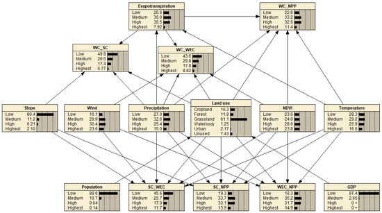 Following parametric learning, the BBN was able to represent prior probabilities of the status of the study area. According to the process mechanism of ecosystem services, the relevant variables in each ecological process in 2020 were selected as nodes to learn the structure of the Bayesian network. As shown in Figure 5, the constructed Bayesian conceptual network contained 15 nodes and 34 arrows. Six types of trade-off intensities were the target nodes, and nine variables (such as population density, slope, precipitation, land use, temperature, NDVI, wind speed, evapotranspiration, and GDP) were the influencing factors nodes. The probabilities of the four states (Low, Medium, High, and Highest) in terms of the WC_SC were weighed from low to high as 49.8%, 26.0%, 17.4%, and 6.77%. Those of WC_WEC from low to high were 43.6%, 29.8%, 17.8%, and 8.82%. The probabilities of the WC_NPP were 22.8%, 33.2%, 32.6%, and 11.4%, while the states of the SC_WEC had probabilities of 45.6%, 25.7%, 17.0%, and 11.7%. The probabilities of the states in terms of the SC_NPP were 19.3%, 33.7%, 33.1%, and 13.9%, while those in terms of the WEC_NPP were 18.3%, 35.2%, 31.7%, and 14.9%.