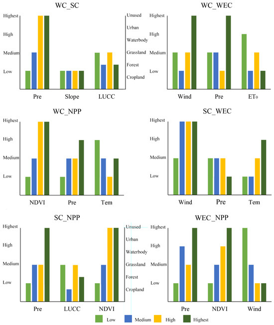 Figure 6 shows that three key variables that influenced the strength of trade-offs for different ecosystem services. For example, in the case of WC_SC: precipitation, slope, and land use. Their values varied according to whether the trade-offs were Low, Medium, High, or Highest (Table S2).
